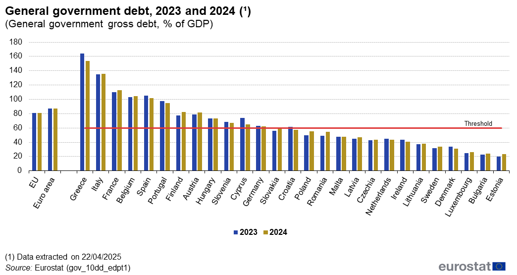 Pentru comparația cu alte țări UE, iată ce datorii publice au avut diferite țări UE în anul 2024, conform Eurostat (datorii exprimate tot ca procent din PIB):