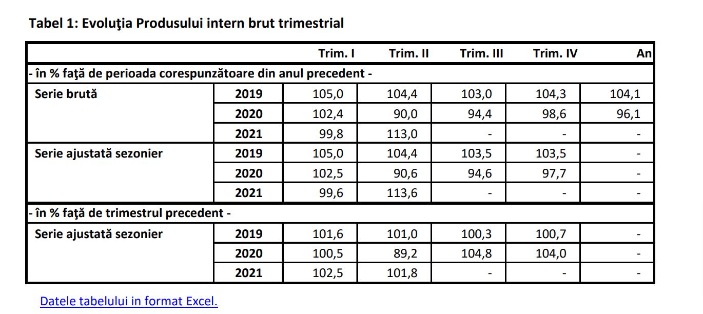 Același document INS prezintă și un tabel comparativ pe anii 2019-2021, pentru "seria brută" și "seria ajustată sezonier" a evoluției Produsului intern brut trimestrial.