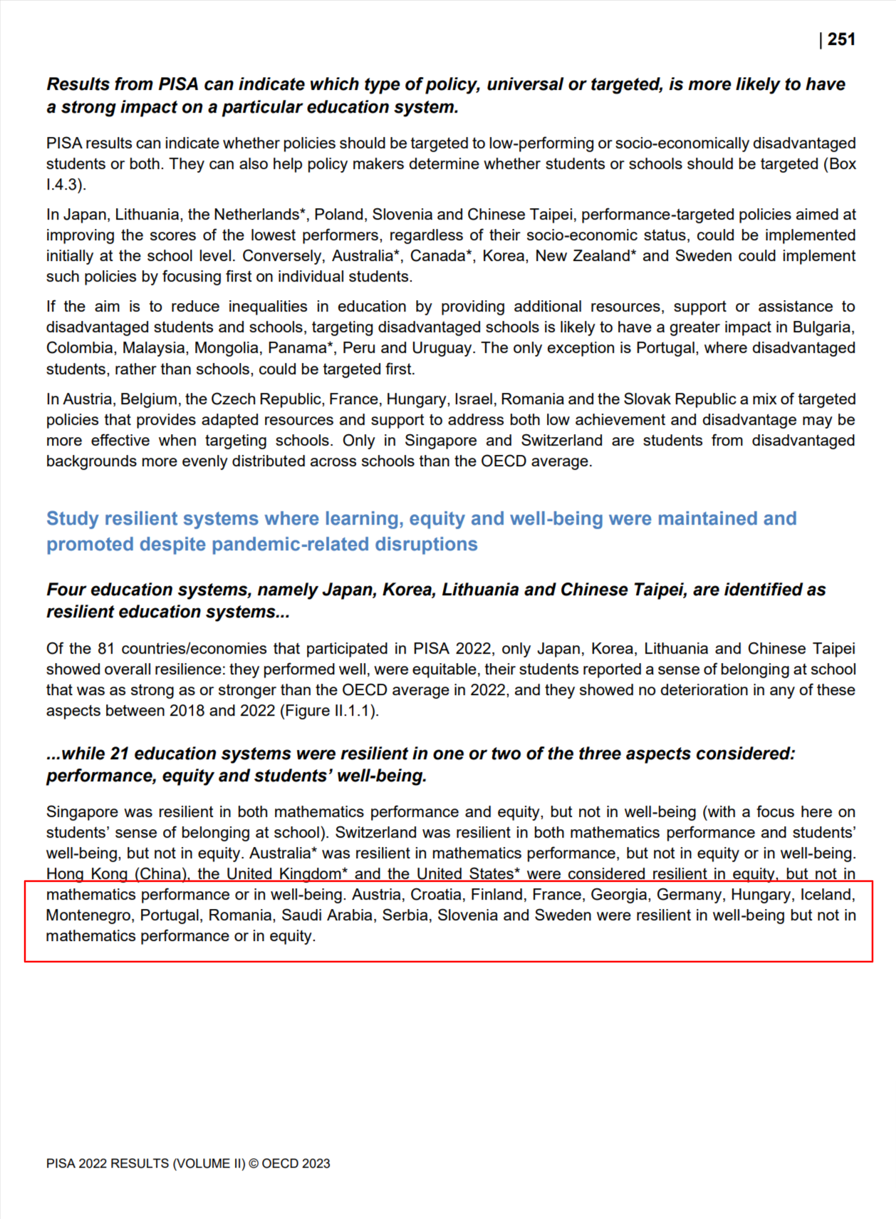 Conform aceleiași publicații, la secțiunea 7 intitulată "From data to insights", la pagina 253 scrie că România a avut în 2022 un sistem de educație rezilient doar la capitolul "Bunăstarea elevilor":