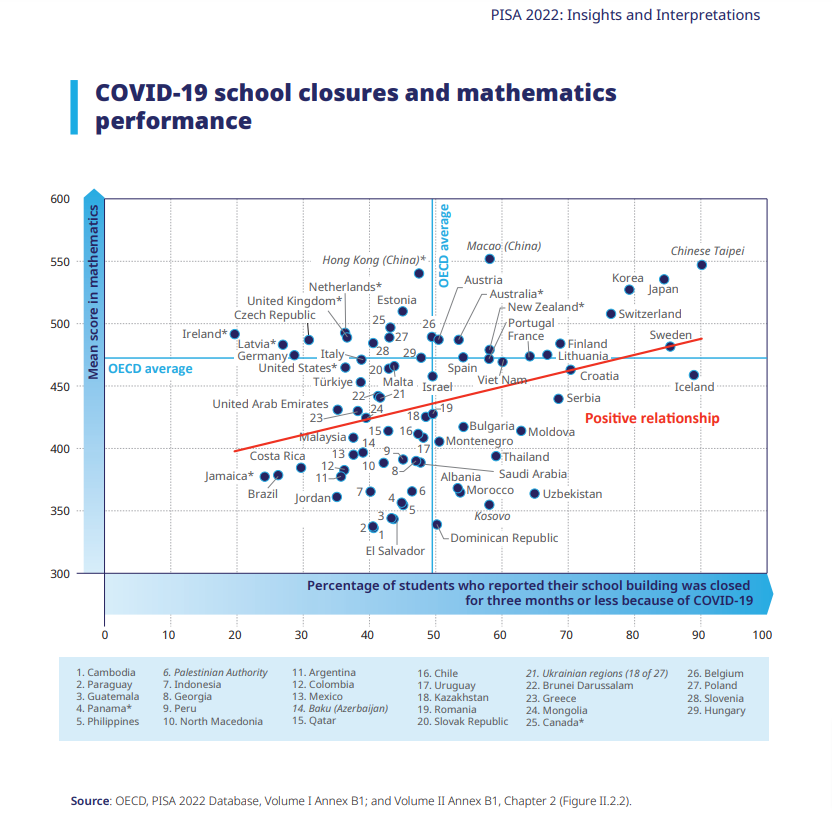 Graficul de la pagina 15 a publicației "PISA 2022 Insights and Interpretations" sugerează o corelare pozitivă între performanța matematică mai bună a elevilor și durata mai scurtă de închidere fizică a școlilor, din cauza COVID-19; cu alte cuvinte, țările care au închis fizic școlile mai puțin timp în cursul pandemiei de COVID-19 au avut elevi mai buni la matematică la testele PISA 2022.