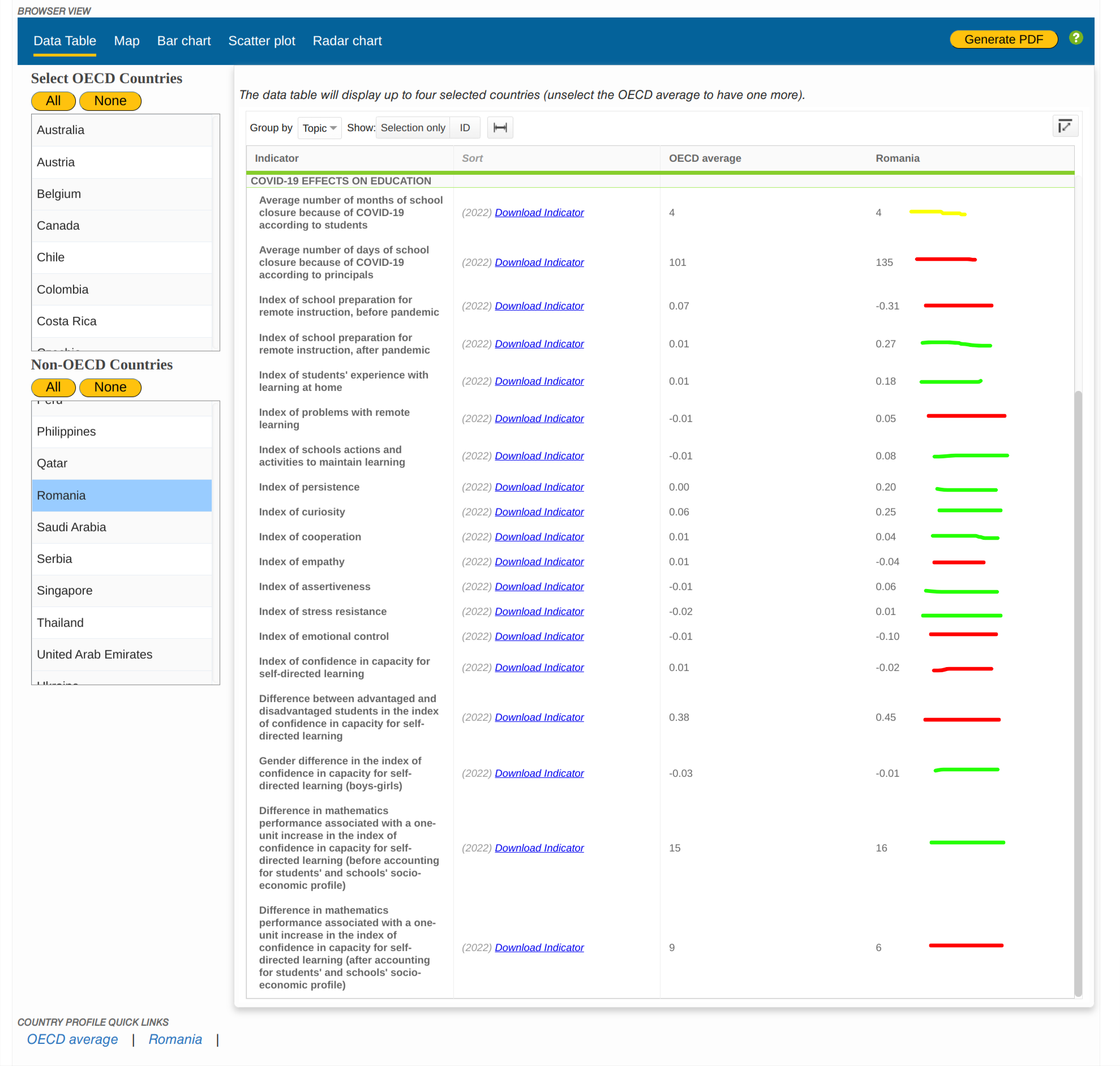- pentru un indicator, identic cu media OECD (linia galbenă);
