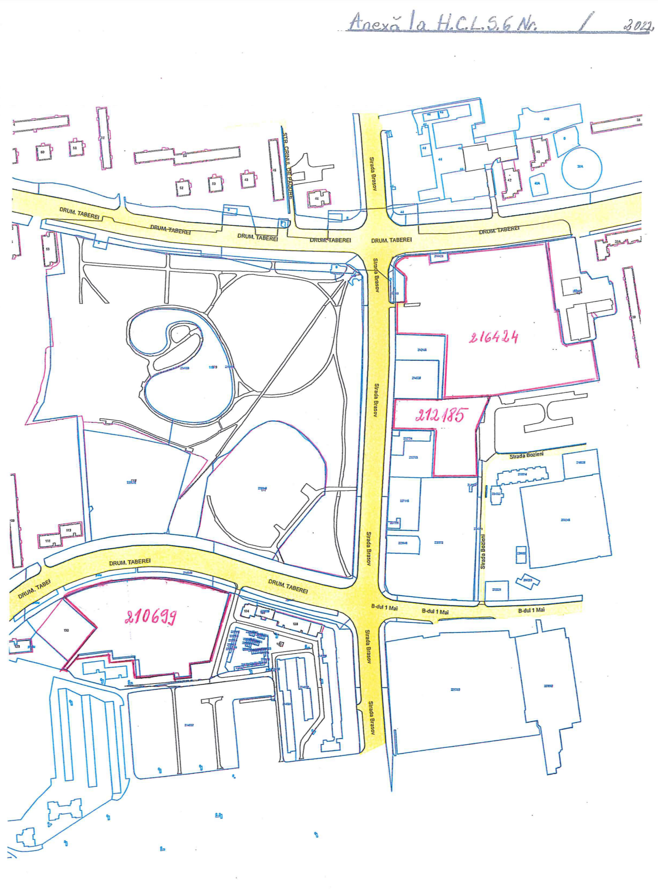 Captură de ecran pentru pagina 2 a Hotărârii Consiliului Local Sector 6 nr. 82/05.04.2022, care arată amplasarea pe hartă a celor 3 terenuri din zona Parcul Drumul Taberei, cu numerele cadastrale 210699, 212185 și 216424, propuse pentru a fi amenajate ca spații verzi, în cazul în care se aprobă transferul acestora din administrarea Ministerului Apărării Naționale în administrarea Primăriei Sectorului 6.