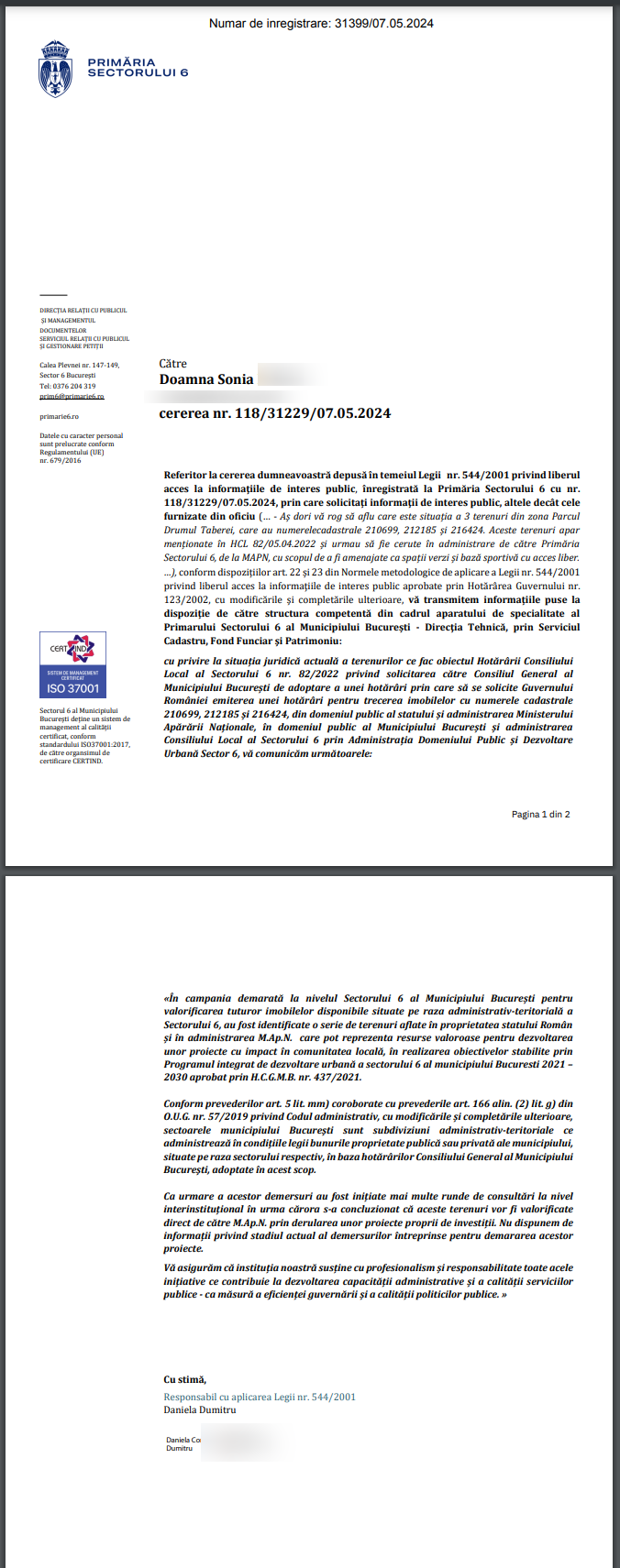 Am cerut și răspunsul oficial al Primăriei Sectorului 6, pentru a afla dacă aceste 3 terenuri au fost obținute în administrare (condiția de bază pentru ca terenurile să poată fi amenajate ca spații verzi). Răspunsul primit a confirmat faptul că aceste 3 terenuri nu au mai ajuns în administrarea Primăriei Sectorului 6, așa cum și-ar fi dorit Ciucu: