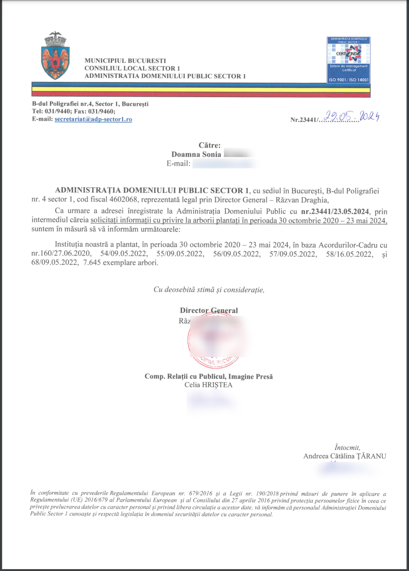 În baza Legii 544/2001 privind liberul acces la informațiile de interes public, am cerut un răspuns oficial de la Administrația Domeniului Public Sector 1 (ADP Sector 1), referitor la numărul arborilor plantați în perioada 30 octombrie 2020 - 23 mai 2024, conform contractului de achiziție publică publicat în SEAP la această pagină.
