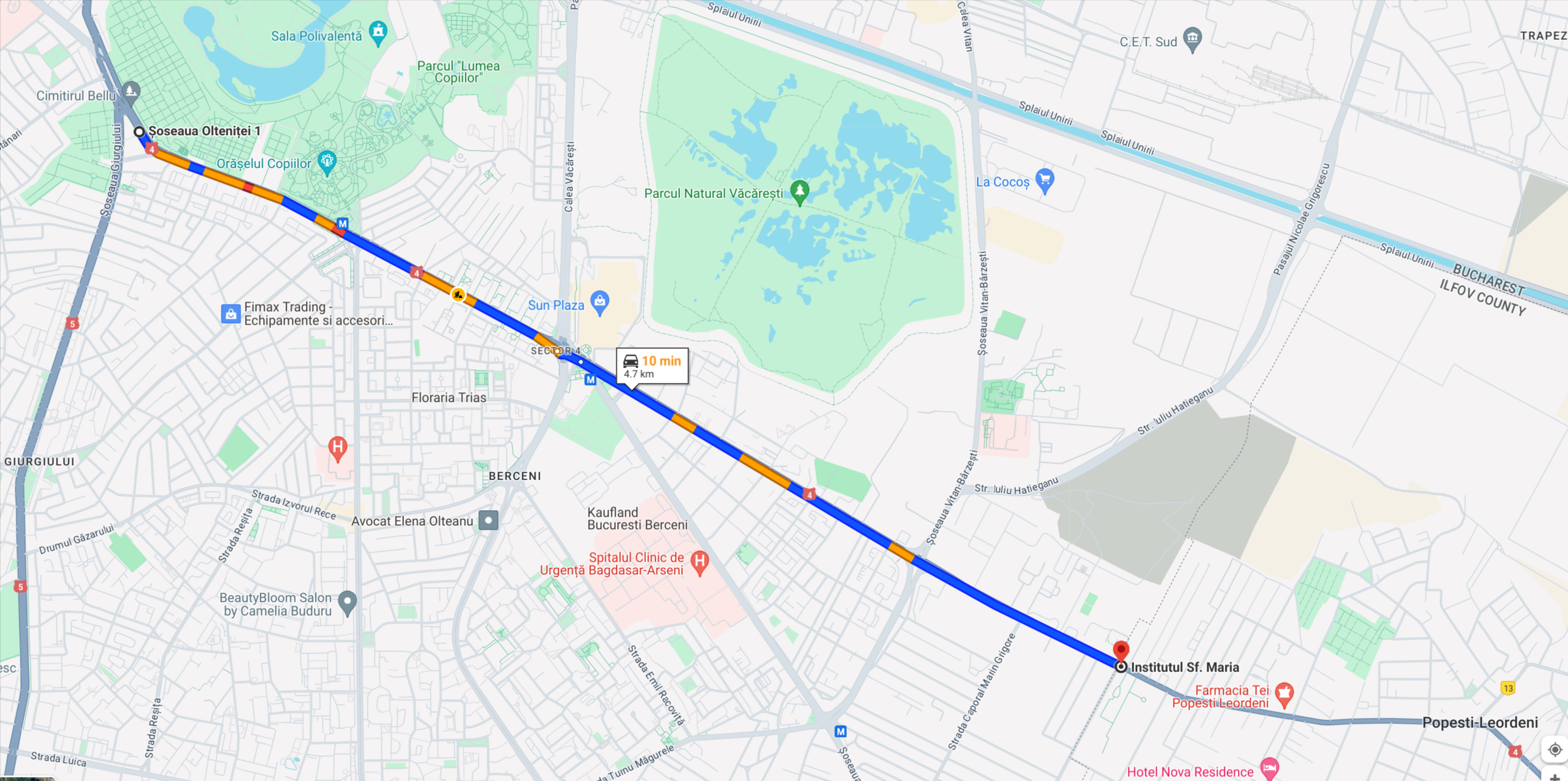Captură de ecran de pe Google Maps, cu Șoseaua Olteniței din București, care pornește de la intersecția Calea Șerban Vodă cu Șoseaua Giurgiului și se termină în dreptul stației de transport în comun 'Institutul Sf. Maria'.