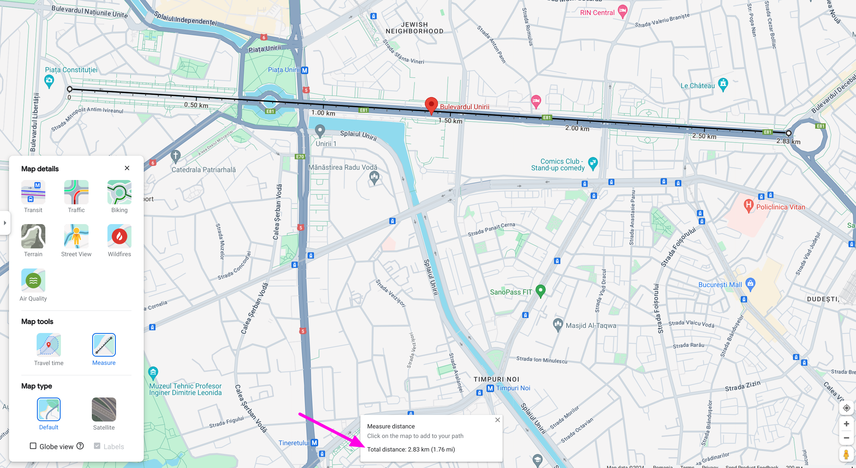 Captură de ecran de pe Google Maps, cu lungimea bulevardului Unirii din București, calculată cu Google Maps Measure ca fiind 2,8 km.