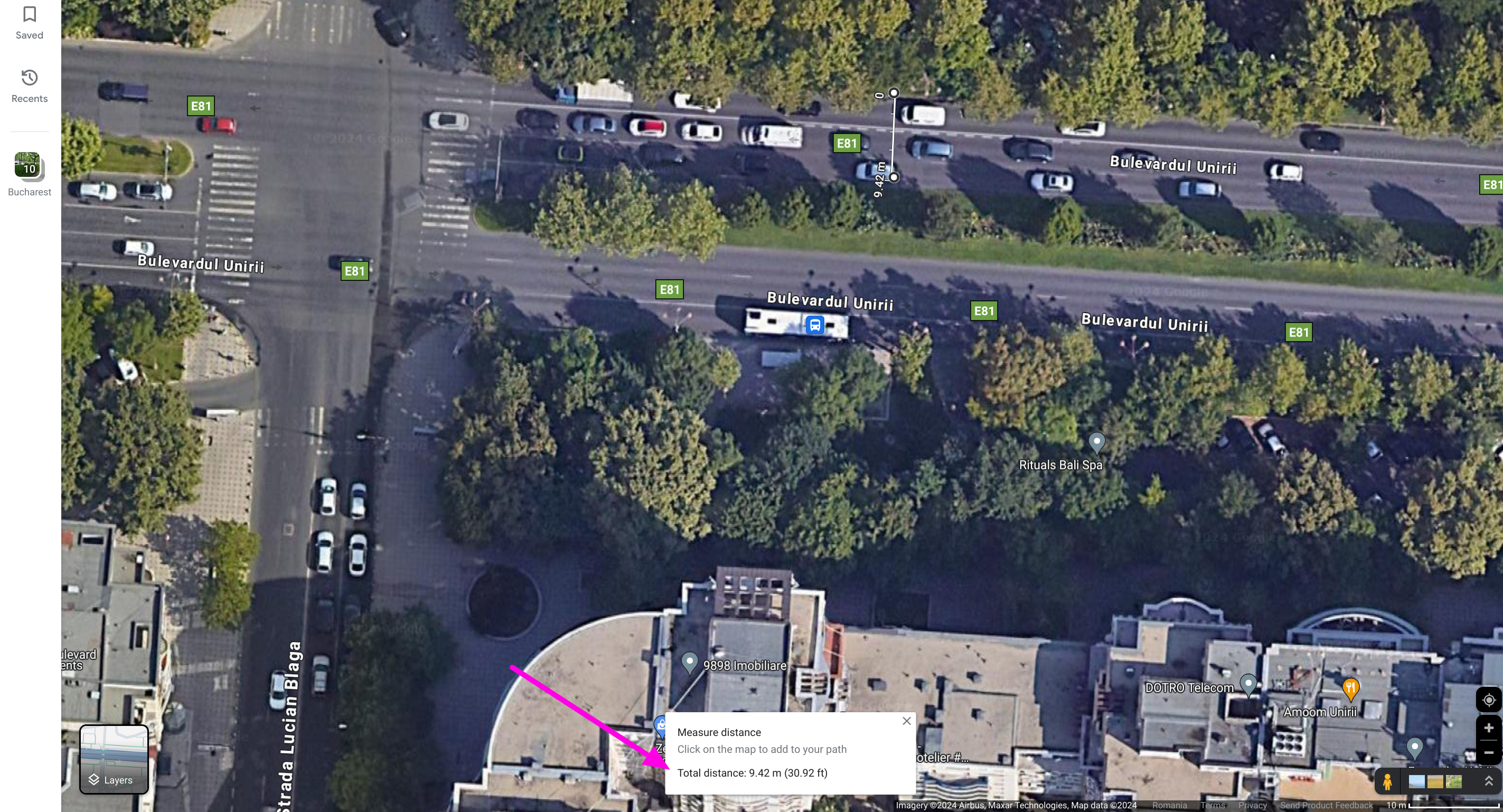 Captură de ecran de pe Google Maps, cu bulevardul Unirii din București, segmentul dintre intersecția cu strada Lucian Blaga și Piața Alba Iulia. În imagine se observă că lățimea unui sens carosabil a fost calculată de Google Maps Measure ca fiind aproximativ 9,4 m.