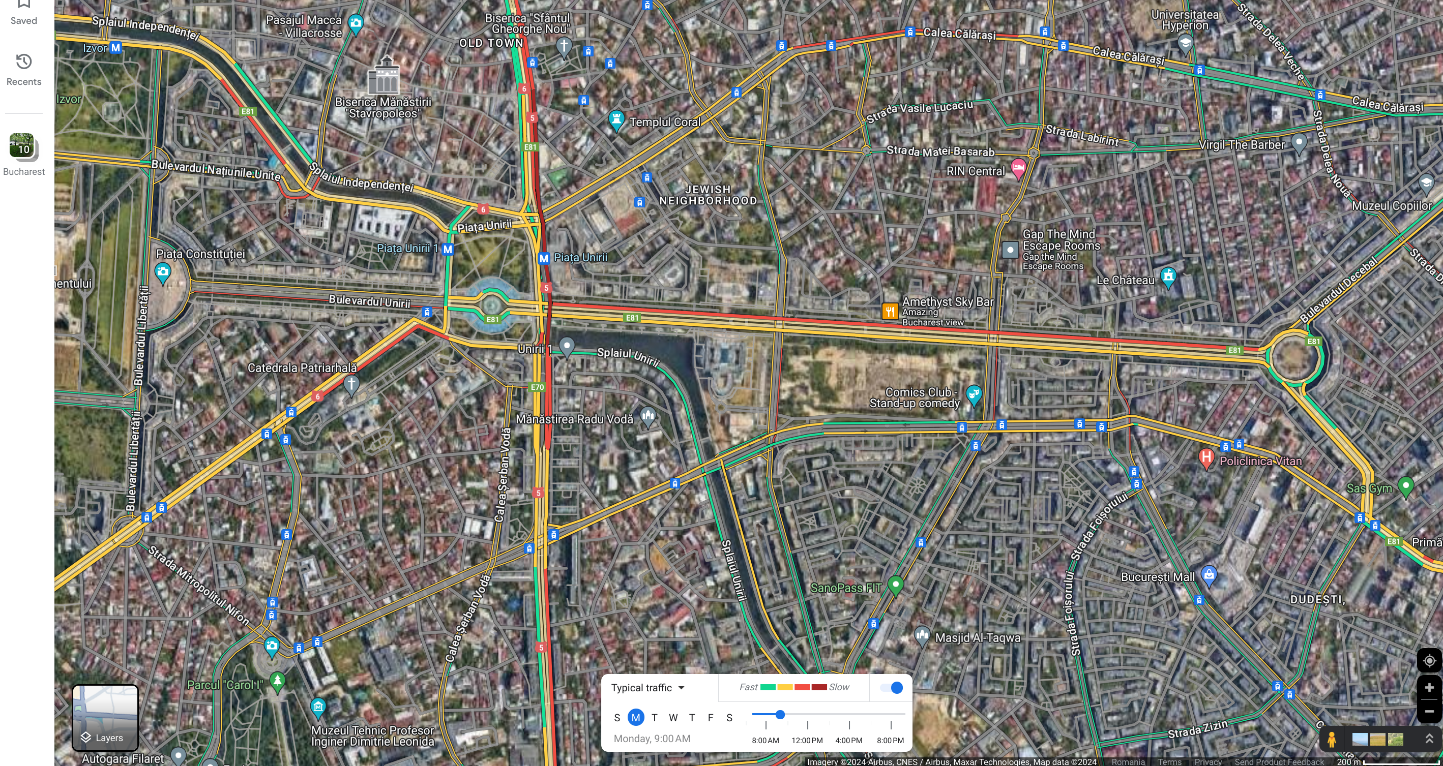 Captură de ecran de pe Google Maps, cu bulevardul Unirii din București și volumul de trafic tipic acestui bulevard, într-o dimineață de luni. Date de trafic furnizate de Google Maps, layerul 'Traffic', opțiunea 'Typical traffic'.