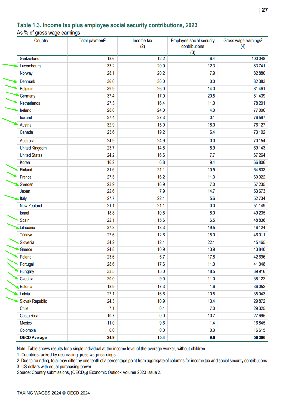 3 - tabelul 1.3 din raportul OECD se referă la angajații cu venituri medii. În particular, în Belgia taxa pe venit este stabilită progresiv: pentru salarii mai mici de 15,820 euro taxa este 25%, pentru salarii între 15,820 - 27,920 euro taxa este 40%, pentru salarii între 27,920 - 48,320 euro taxa este 45%, iar pentru salarii mai mari de 48,320 euro taxa este de 50%. În cazul Belgiei, tabelul 1.3 din raportul OECD a luat în calcul cea mai mică categorie de salarii, care este impozitată cu 25% taxă pe venit, plus 14% taxă la asigurări sociale, plus contribuția specială la asigurări sociale, care este între 9.3 și 60.94 euro pe lună (0.05 - 0.38% din salariu).
