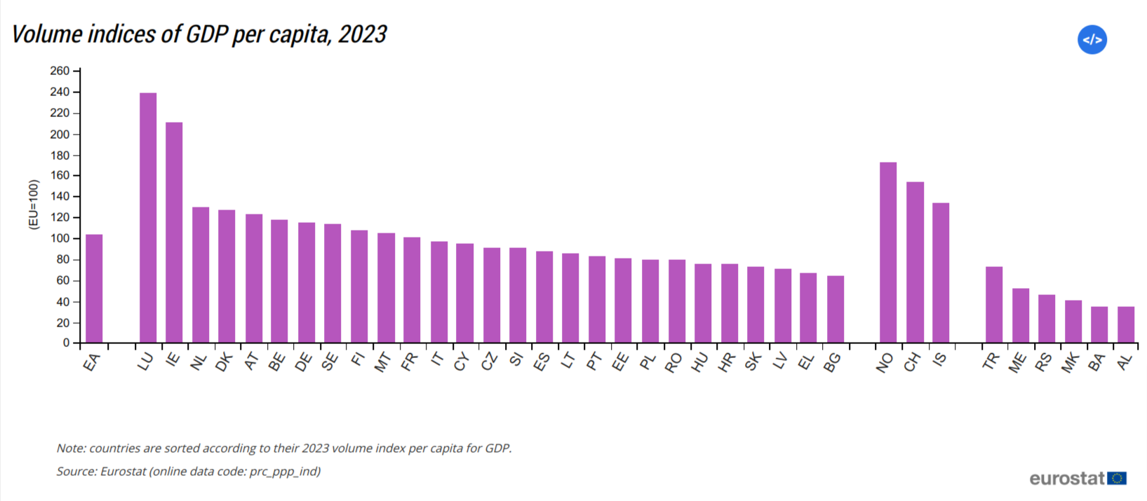 Captură de ecran pentru un grafic Eurostat, ce reprezintă țările UE ordonate descrescător în funcție de PIB, în cursul anului 2023. Date Eurostat publicate pe 19 iunie 2024.