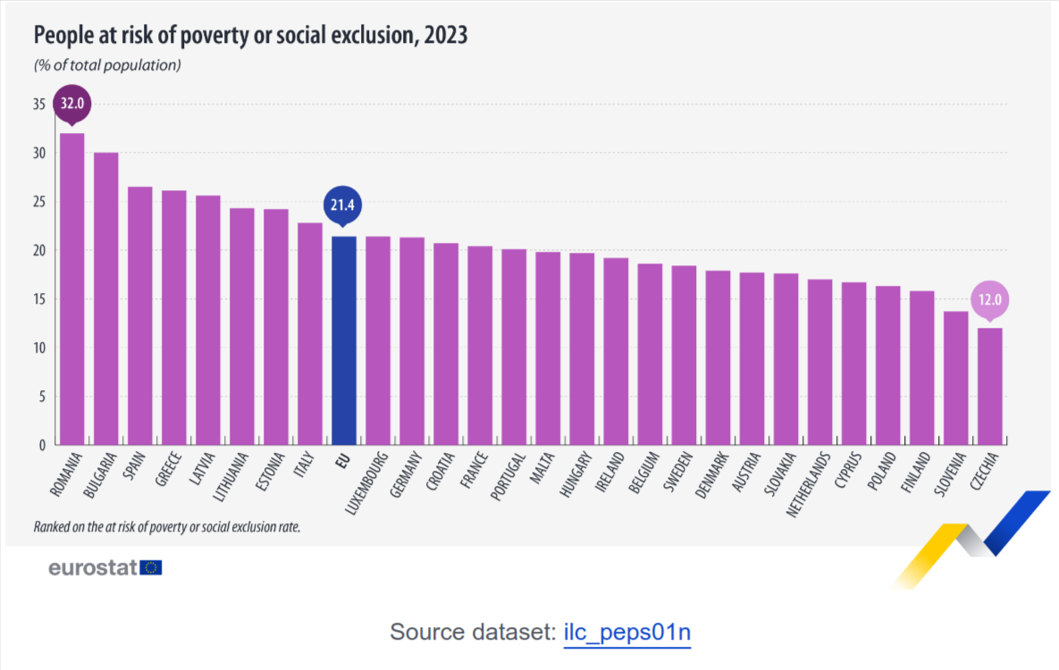 Conform unui articol Eurostat publicat în iunie 2024, 32% dintre români erau expuși riscului de sărăcie sau excluziune socială în anul 2023: