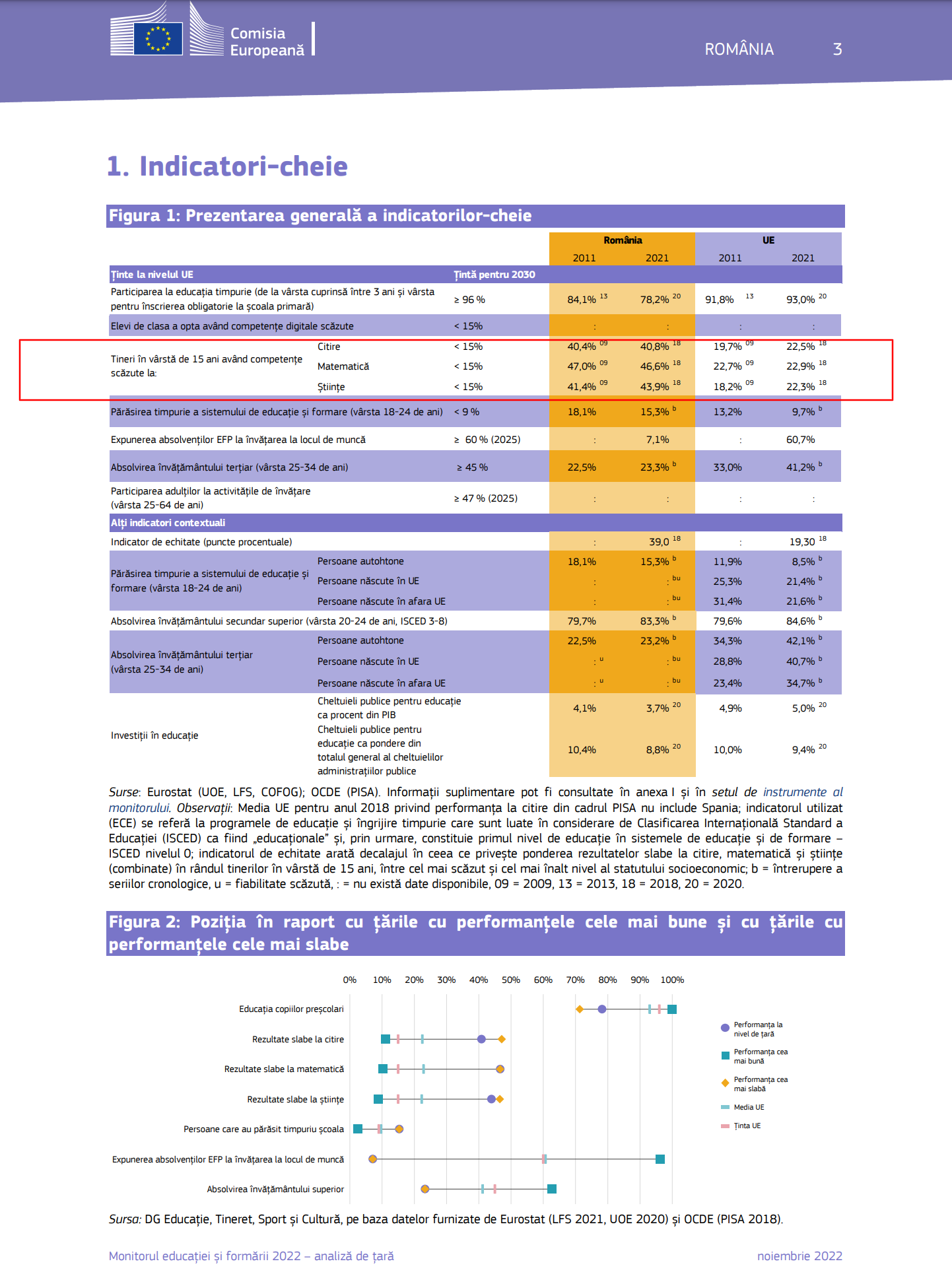 - 40,8% din tinerii de 15 ani (clasa a opta) au competențe scăzute la citire, față de 22,5% media în UE;
