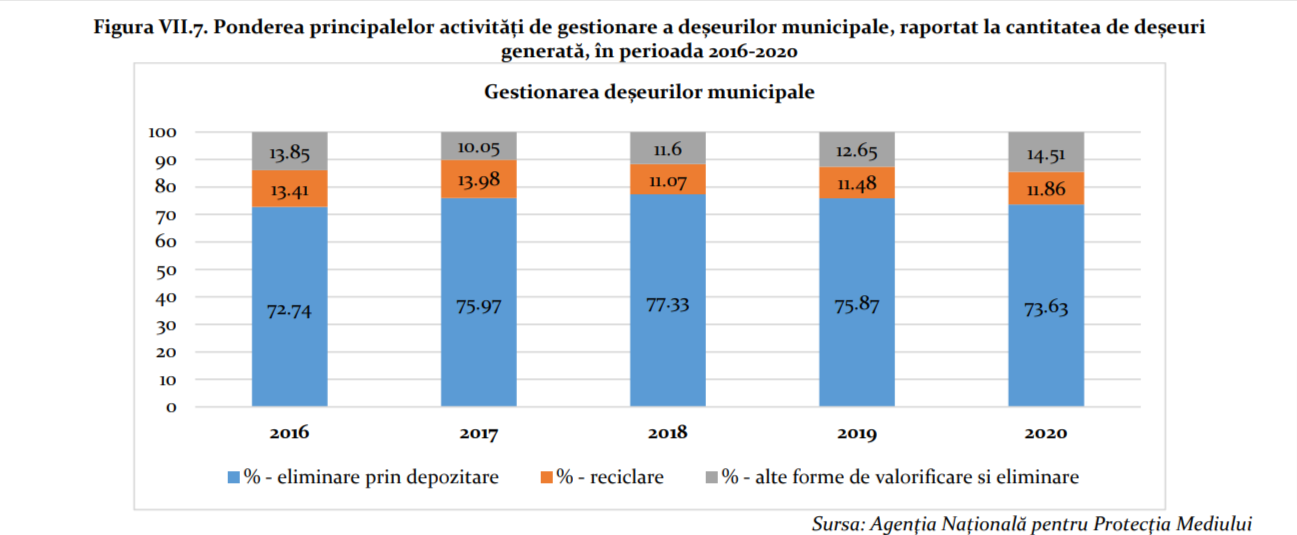 Conform celui mai recent Raport anual de mediu al Agenției Naționale pentru Protecția Mediului, publicat în 2021, rata de reutilizare și reciclare în România în perioada 2016-2020 a avut valoarea medie de 25%: