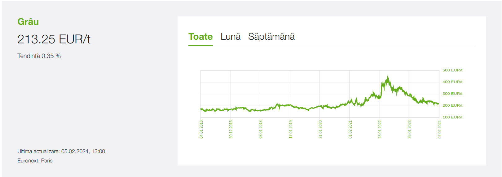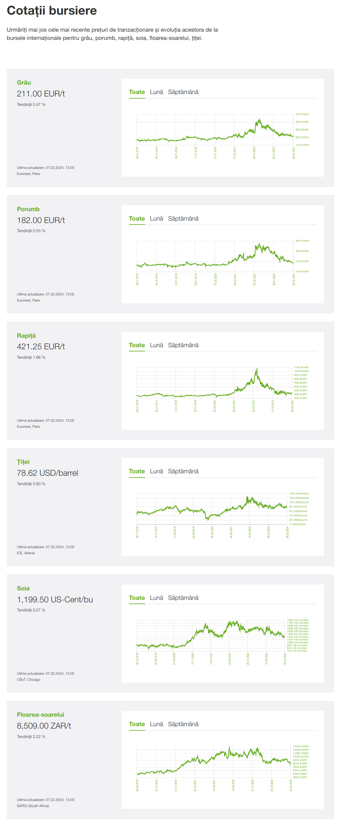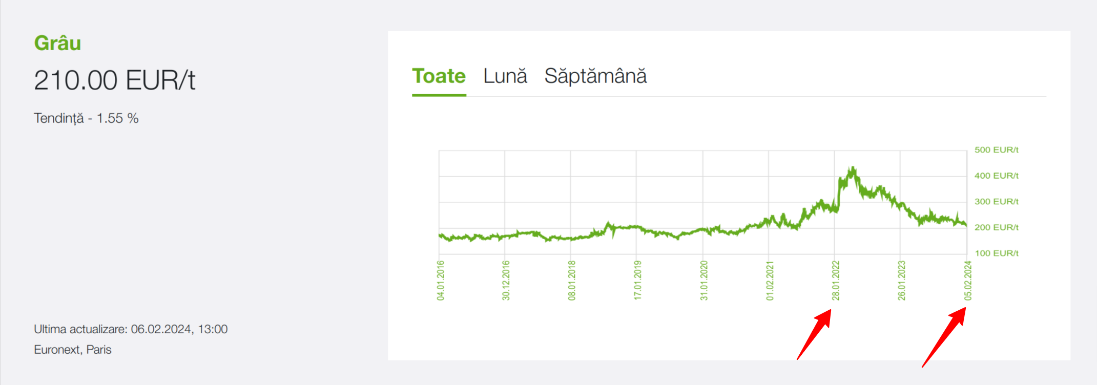 În momentul de față știm foarte bine că atunci când a început războiul în Ucraina, Rusia a început acest război absurd în Ucraina, practic piața de cereale la nivel mondial s-a dezechilibrat. Practic o tonă de grâu în anul în care a fost acest război, era undeva la 1,8 lei pe kilogram, asta înseamnă 1800 de lei pe tonă și după reglarea tuturor lucrurilor care s-au întâmplat atât în piața mondială de cereale, prețul cerealelor în momentul de față este undeva la 0,9 lei. Dar cred că atât cei care aduc contracte către fermieri, vorbim de contractele futures pe care le aduc către fermieri să fie încheiate până la sfârșitul lunii februarie, cred că prețurile cerealor vor crește și bineînțeles fermele din România cu toate formele de sprijin pe care noi le avem deja publicate în Monitorul Oficial, vorbim aici de un grant de 100 de euro pentru toate culturile din toamna anului 2022, 100 de euro pe hectar, în sectorul zootehnic vorbim de 100 de euro pe cap de animal și în sectorul suine 100 de euro pe UVM [Unitate Vită Mare, n.n.]. (…) Plăți directe către fermieri în anul 2024 vor fi de 3,3 miliarde de euro. Pe lângă aceste plăți directe, granturi către fermierii români.