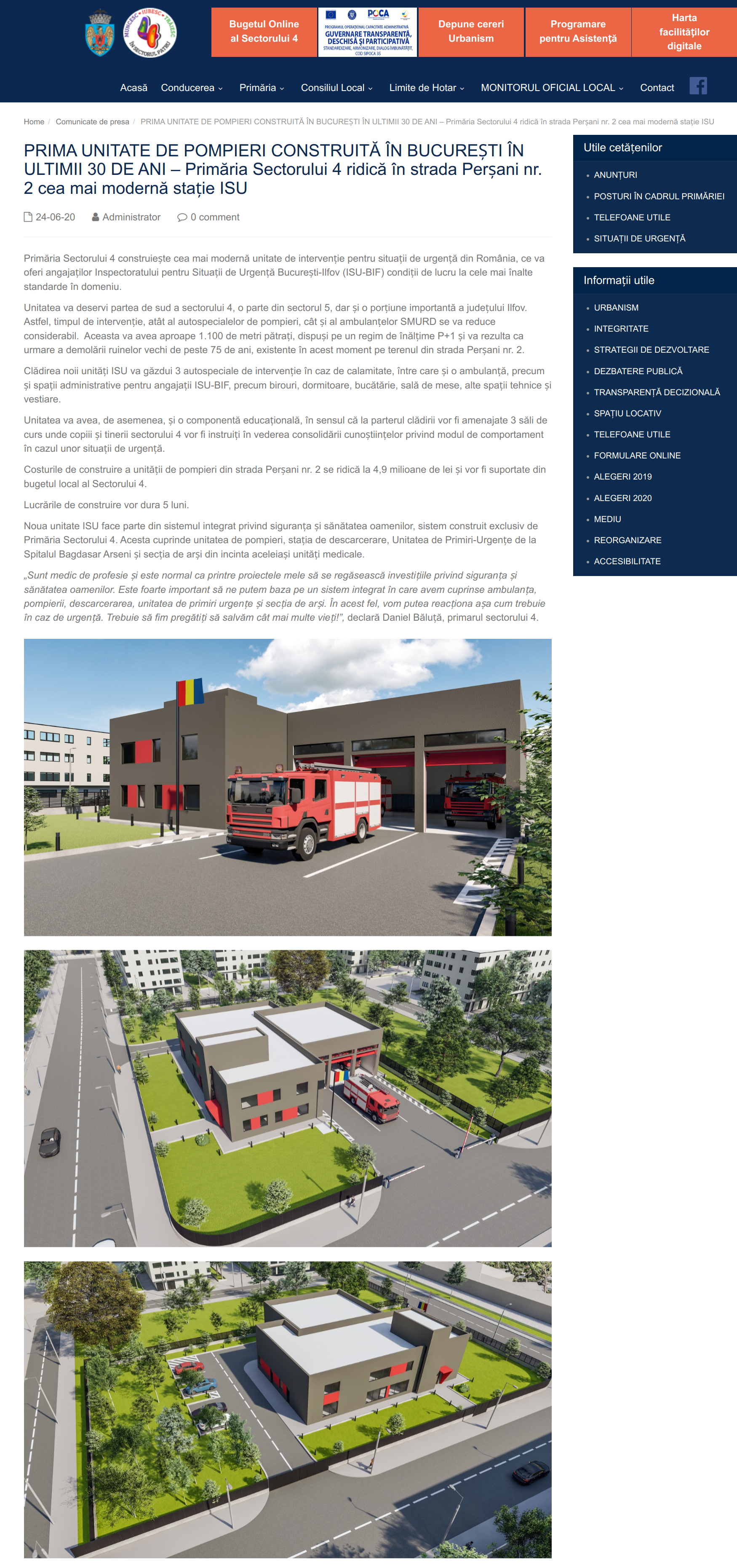 Captură de ecran pentru comunicatul de presă al Primăriei Sectorului 4, din 24 iunie 2020, care anunța construirea unei unități de de intervenție pentru situații de urgență în strada Perșani nr. 2, București, cu termen de construire 5 luni.