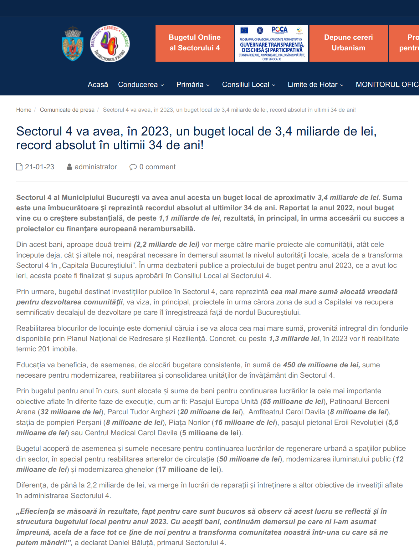 Captură de ecran pentru comunicatul de presă al Primăriei Sectorului 4, din 21 ianuarie 2023, în care se anunțau proiectele finanțate din bugetul local pe anul 2023, unul dintre acestea fiind stația de pompieri de pe strada Perșani nr. 2.