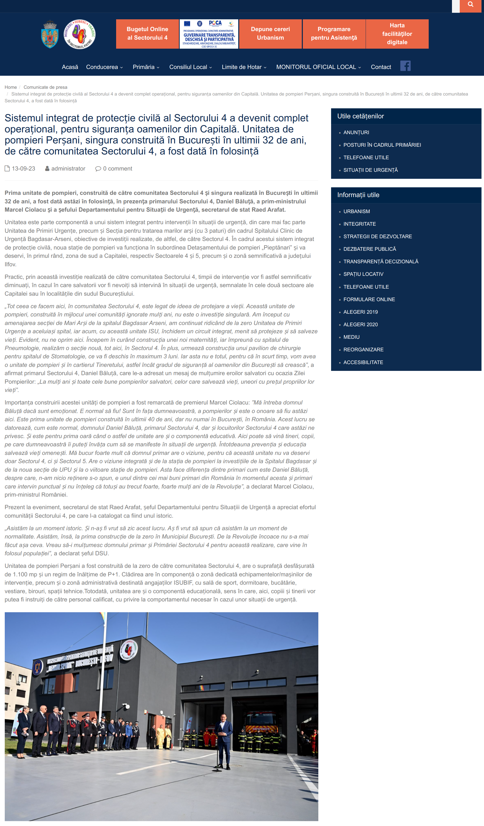 Captură de ecran pentru comunicatul de presă al Primăriei Sectorului 4, din 13 septembrie 2023, care anunța inaugurarea unității de pompieri de pe strada Perșani nr. 2.