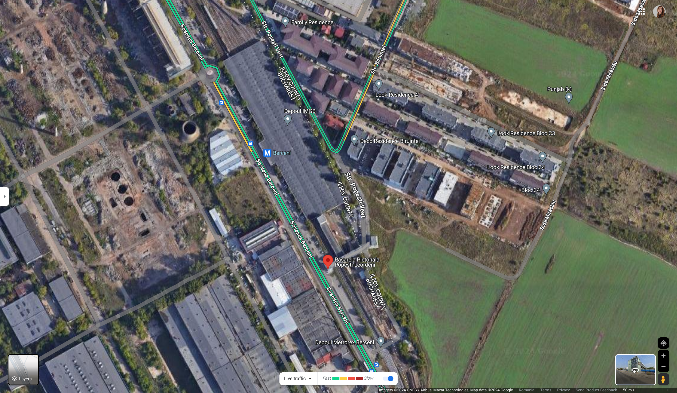 Iată și o fotografie de pe Google Maps (vedere din satelit), cu poziționarea exactă a pasarelei la granița dintre cele două județe (București și Ilfov); ea leagă strada Popești Vest, din orașul Popești-Leordeni, de Șoseaua Berceni din sectorul 4, trecând pe deasupra liniilor de metrou de la Depoul Metrorex Berceni: