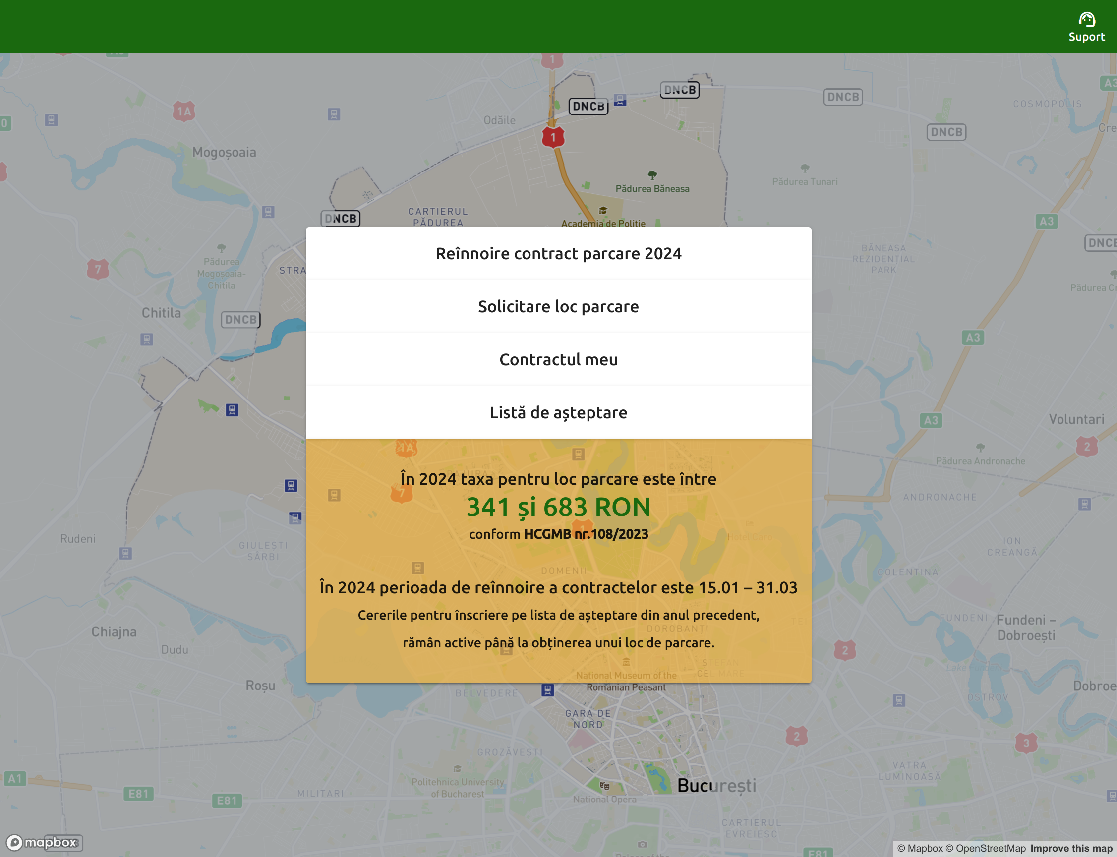 Am găsit pe site-ul primăriei sectorului 1 link-ul către platforma online pe care cetățenii din sectorul 1 pot reînnoi contractul de parcare, pot solicita un loc nou de parcare sau pot vedea detaliile contractului lor curent: https://parcari.adp-sector1.ro/map