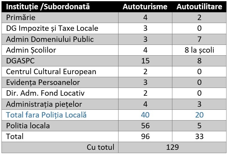 Notă: în tabelul de mai sus s-a strecurat o greșeală de calcul pe rândul 10, coloana a treia (totalul fără Poliția Locală este 28 de autoutilitare, nu 20, dar totalul însumat cu autoutilitarele Poliției Locale este corect, adică 28+5=33). Această greșeală nu afectează totalul absolut, adică total coloana 1 + total coloana 2, adică 96+33 = 129.