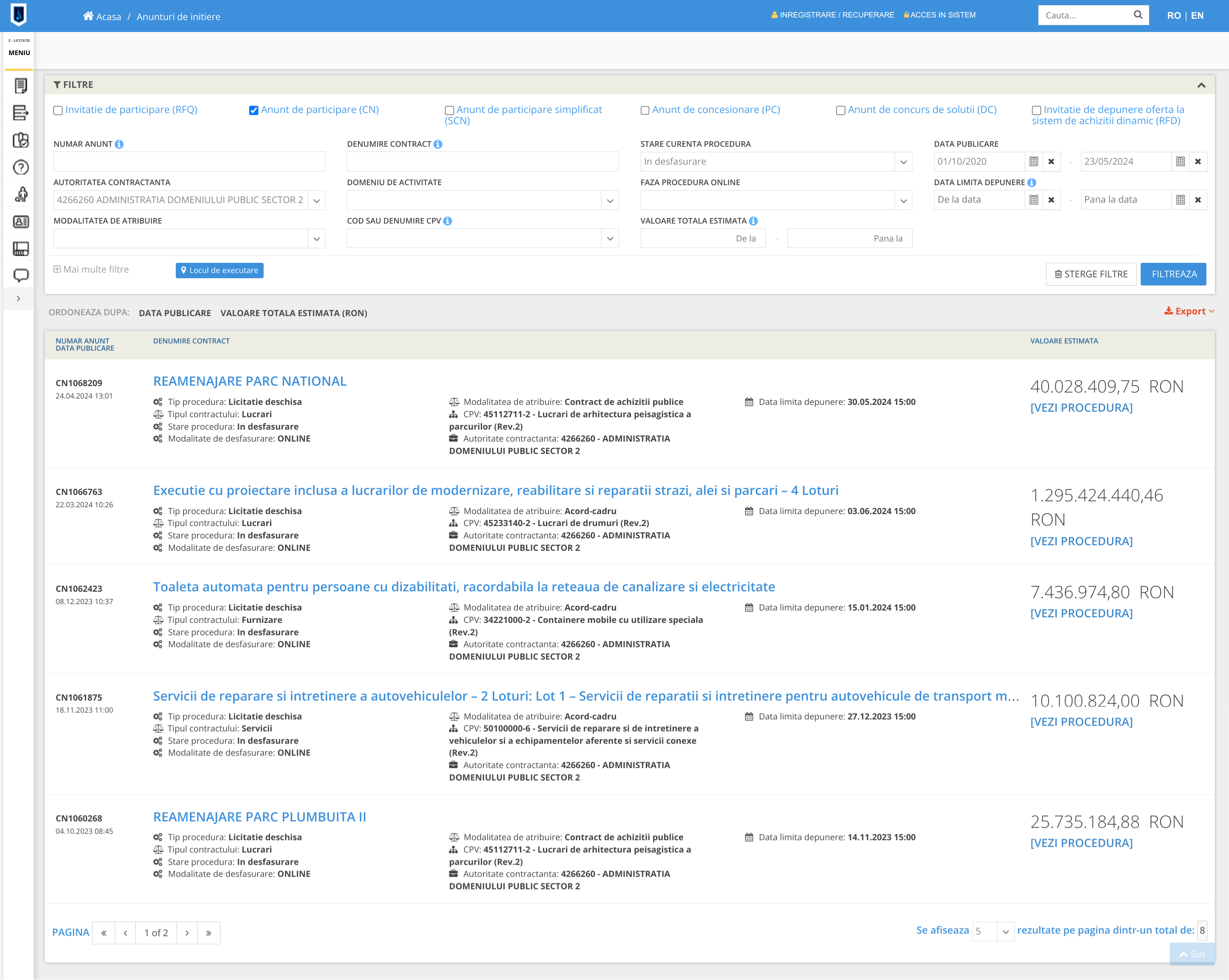 Captură de ecran pentru platforma online SEAP (www.e-licitatie.ro), pagina unei căutări pentru toate anunțurile de achiziții publice lansate de Administrația Domeniului Public Sector 2, începând cu data de 1.10.2020 și până în prezent. În imagine se pot vedea o parte din filtrele disponibile pentru căutare.