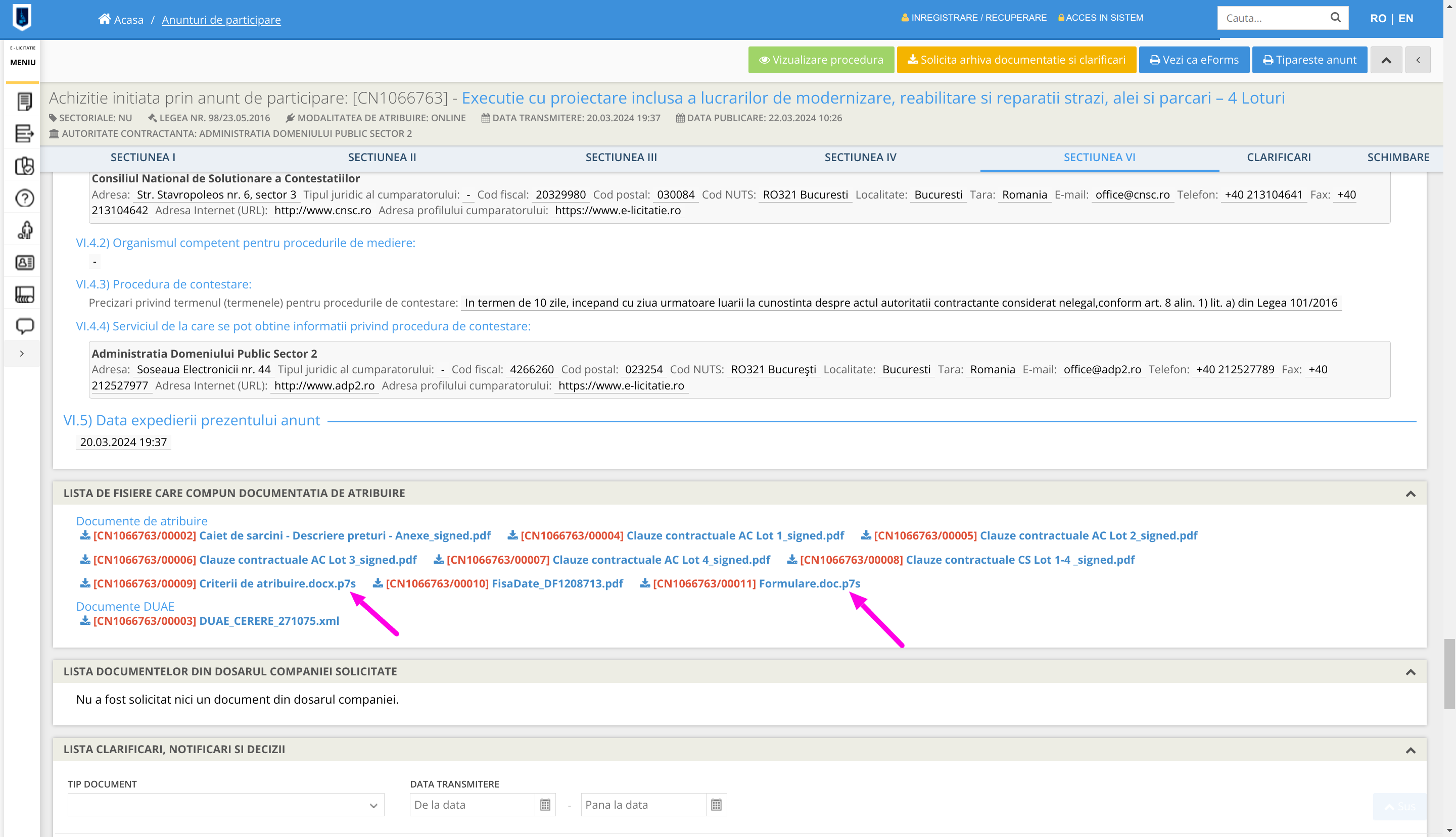 Captură de ecran pentru platforma online SEAP (www.e-licitatie.ro), pagina unei achiziții publice inițiată de Administrația Domeniului Public Sector 2. În imagine se vede cum unele documente atașate acestui anunț sunt publicate în format .p7s, care nu este cunoscut cititorului de rând.