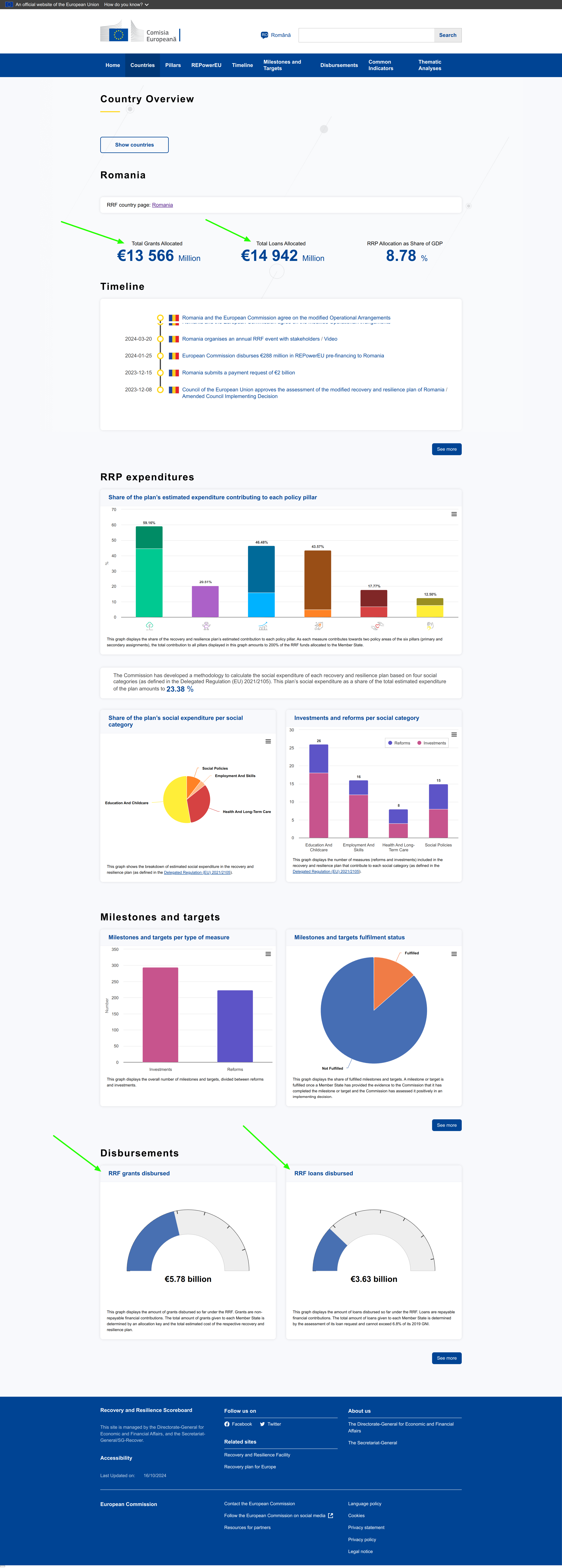 Stadiul de implementare al PNRR-ului României arăta așa la data de 17 octombrie 2024 (click pe Romania în această pagină, nu există link dedicat țării):