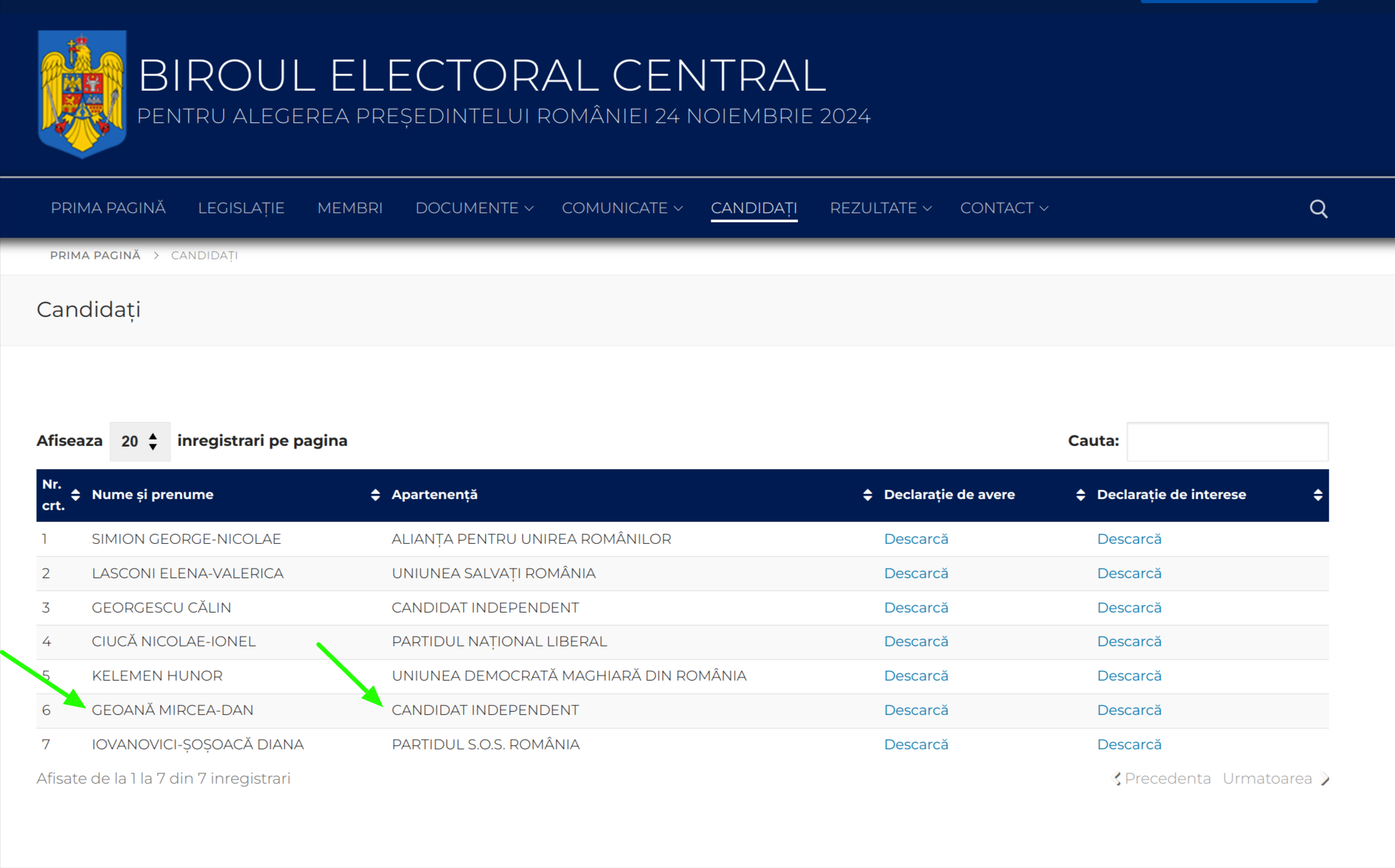 Captură de ecran pentru pagina 'Candidați la alegerile prezidențiale din 24 noiembrie 2024', de pe site-ul Biroului Electoral Central, BEC (captură făcută la data de 6 octombrie 2024). În imagine se observă că la poziția nr. 6 din lista candidaților se află Mircea Geoană, care figurează ca independent.