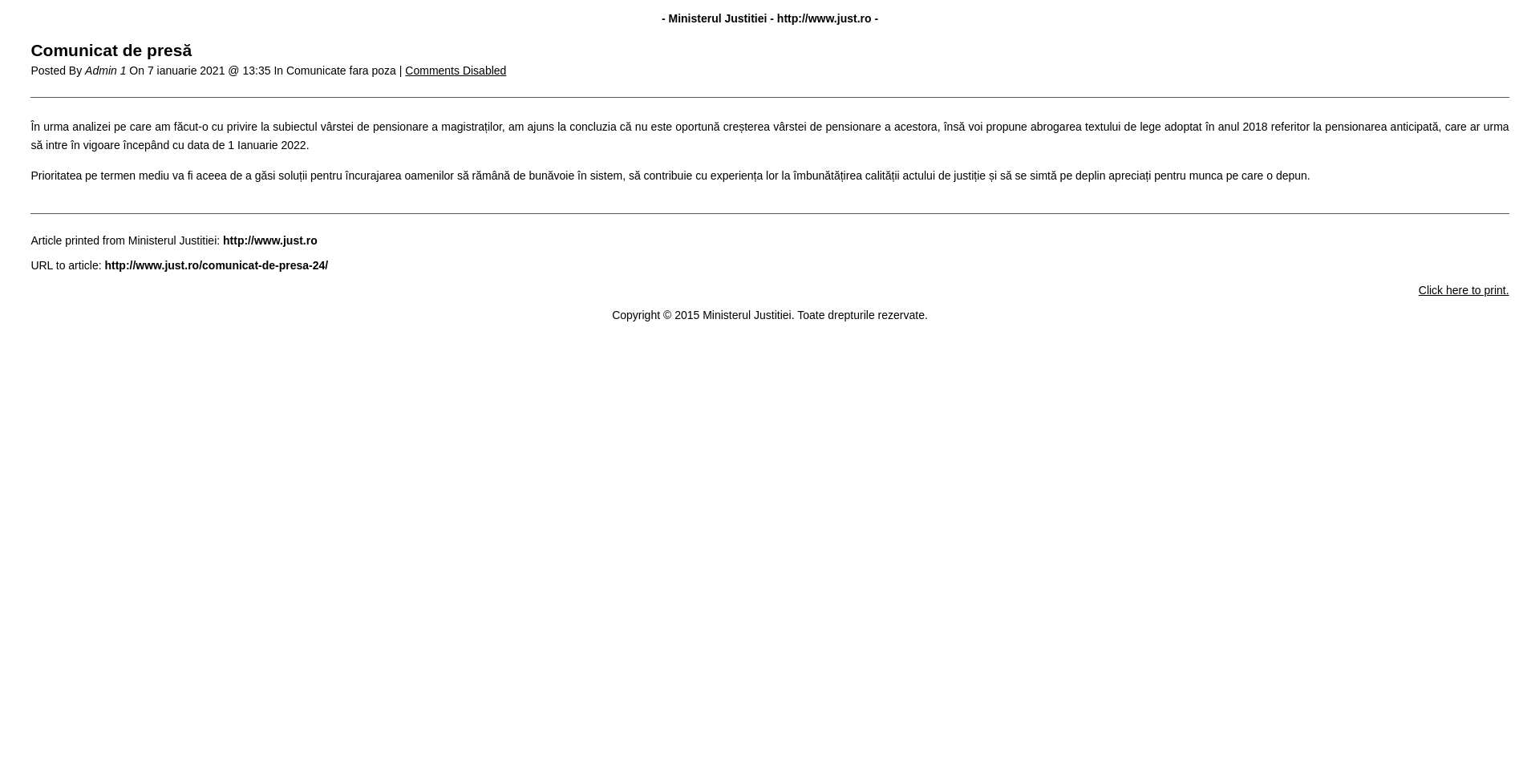 Pe 7 ianuarie 2021, Ministerul Justiției a emis următorul comunicat de presă în care se renunță la ideea de creștere a vârstei de pensionare a magistraților: